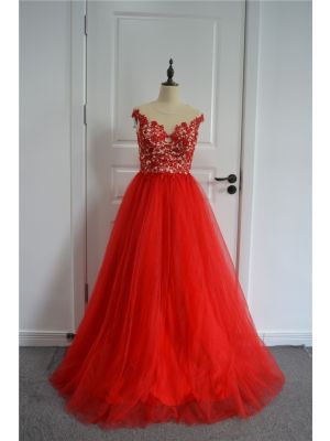 - Stunning Beaded Ball Gown Prom Party Dress Illusion Neckline Cap Sleeves Red Lace Tullewas $622.00 Special Price $37.00
