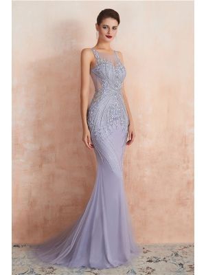 2. Mermaid Illusion Neckline Open Back Grey Tulle Lace Beaded Prom Dress