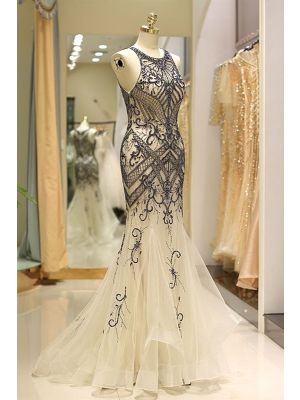 - Stunning Mermaid Long Champagne Tulle Beaded Prom Evening Dress Scoop Sleevelesswas $1,299.00 Special Price $269.00