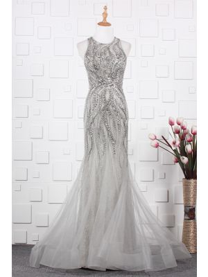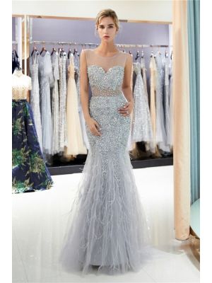 - Gorgeous Sheer Bodice Crystal Sequined Silver Grey Tulle Mermaid Maxi Prom Evening Dress With Featherswas $1,029.00 Special Price $219.00