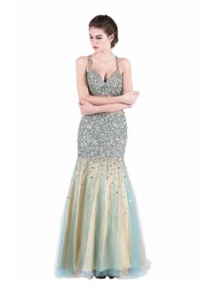 - Trumpet Sweetheart Yellow Satin Aqua Tulle Beaded Prom Dress Cross Strapswas $790.00 Special Price $205.00