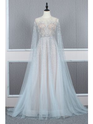 - A Line Illusion Neckline Cap Sleeve Long Aqua Tulle Beaded Prom Dresswas $595.00 Special Price $158.55