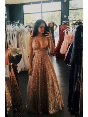 18. Gorgeous A Line Deep V Neck Backless Sequined Champagne Prom Evening Dress