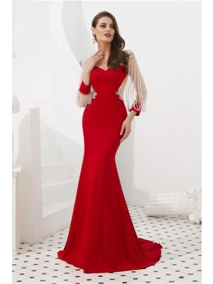 - Elegant Illusion Neckline Long Sleeve See Through Back Crystal Beaded Red Mermaid Prom Evening Dresswas $806.00 Special Price $179.00