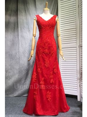 - Elegant V Neck Corset Beaded Red Lace A Line Prom Evening Dress With Appliqueswas $767.00 Special Price $136.00