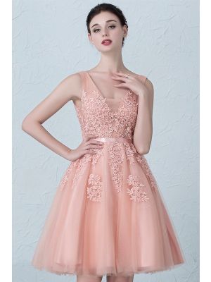 - Ball V Neck Short Blush Pink Tulle Applique Beaded Prom Dresswas $425.00 Special Price $120.00