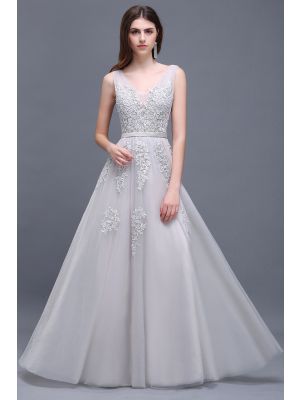 - Modest V Neck Silver Tulle A Line Prom Evening Dress With Appliqueswas $788.00 Special Price $138.00