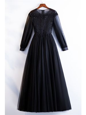 - Stunning Illusion Neckline Long Sleeve Beaded Appliques Black Tulle A Line Prom Evening Dresswas $778.00 Special Price $145.00