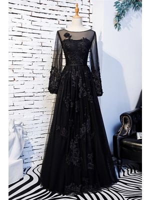 - Elegant Scoop Long Sleeve Beaded Appliques Black Tulle A Line Prom Evening Dresswas $778.00 Special Price $138.00
