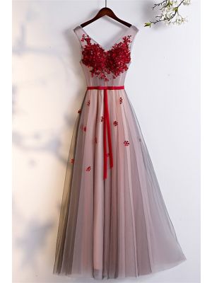 - Elegant V Neck Corset Grey Tulle A Line Prom Evening Dress With Red Appliqueswas $787.00 Special Price $135.00