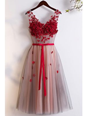 - Elegant V Neck Corset Grey Tulle A Line Tea Length Prom Evening Dress With Red Appliqueswas $755.00 Special Price $125.00