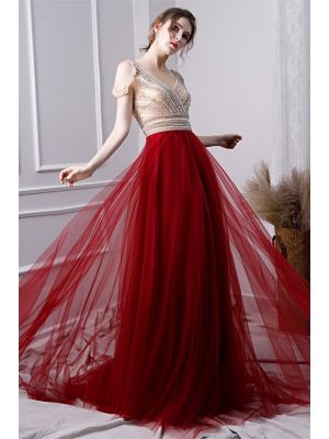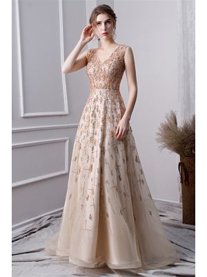 - Gorgeous V Neck Sheer Back Champagne Tulle Crystal Beaded A Line Prom Evening Dresswas $998.00 Special Price $269.00