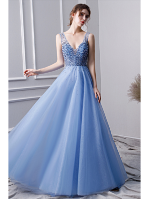 - Gorgeous V Neck Sheer Back Blue Tulle Crystal Beaded A Line Prom Evening Dresswas $888.00 Special Price $149.00