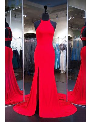 - Graceful Mermaid Halter Sheer Back High Slit Crystal Beaded Red Prom Evening Dresswas $579.00 Special Price $129.00