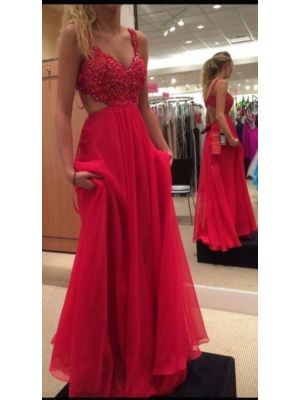 26. Fashion A Line V Neck Cut Out Red Chiffon Prom Evening Dress With Lace Beading