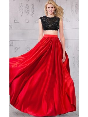 - A Line High Neck Open Back Red Satin Black Lace Two Piece Prom Dresswas $490.00 Special Price $137.50