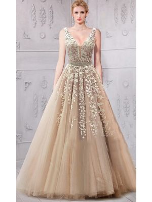 - Classy A Line V Neck Low Back Champagne Tulle Lace Prom Dress Beading Beltwas $700.00 Special Price $175.00