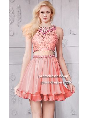 - Cute High Neck Short Mini Coral Chiffon Lace Beaded Two Piece Prom Dresswas $400.00 Special Price $118.50