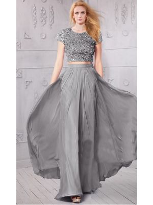 - Flowing Jewel Neckline Cap Sleeve Silver Chiffon Beaded Two Piece Prom Dresswas $600.00 Special Price $149.99