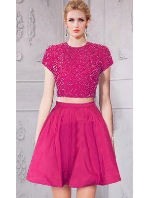 - High Neck Open Back Short Fuschia Taffeta Beaded Two Piece Prom Dress With Sleeveswas $500.00 Special Price $129.90