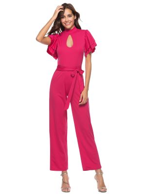 - High Neck Ruffle Sleeve Hot Pink Cut Out Stretch Jumpsuit With Sashwas $120.00 Special Price $37.00