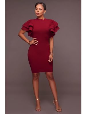 - High Neck Ruffle Sleeve Short Burgundy Stretch Women Casual Dresswas $88.00 Special Price $27.80