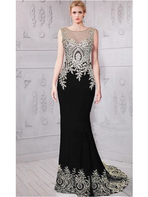 - Sheath Bateau Neckline Sleeveless Black Satin Gold Lace Applique Evening Prom Dresswas $615.00 Special Price $160.00