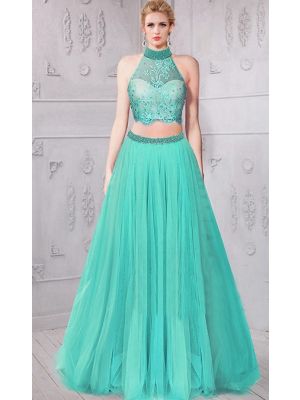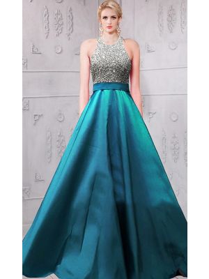 - A Line Halter Long Teal Satin Beaded Evening Prom Dress With Sashwas $600.00 Special Price $150.50