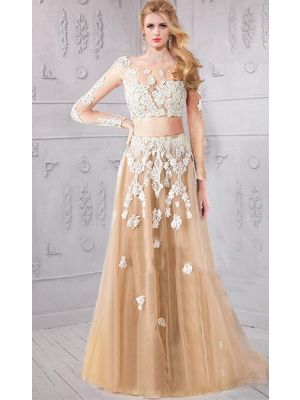 - Bateau Neckline Long Sleeve Champagne Tulle Ivory Lace Two Piece Prom Dresswas $610.00 Special Price $160.00