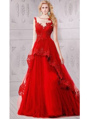 - Beautiful A Line Illusion Neckline Red Tulle Lace Beaded Prom Dresswas $650.00 Special Price $158.00