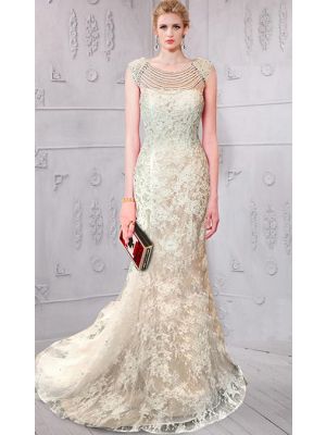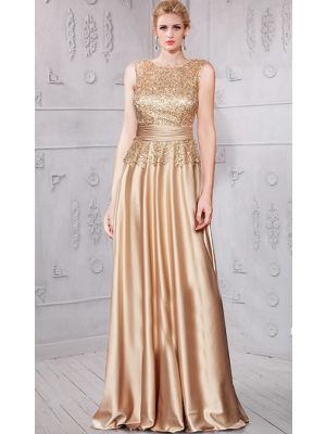 - Sheath Crew Neckline Long Champagne Satin Lace Beaded Evening Dress With Sashwas $475.00 Special Price $139.99