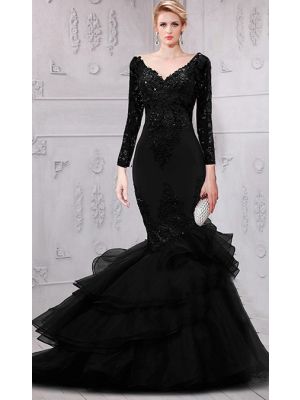 - Mermaid V Neck Black Organza Ruffle Lace Long Sleeve Evening Prom Dresswas $690.00 Special Price $195.00