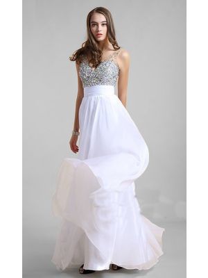 - V Neck Open Back Sleeveless Long White Chiffon Rhinestone Beaded Prom Dresswas $550.00 Special Price $129.99