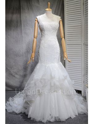 - Elegant Mermaid Scoop Sheer Back Beaded Lace Layered Tulle Wedding Dresswas $928.00 Special Price $189.00