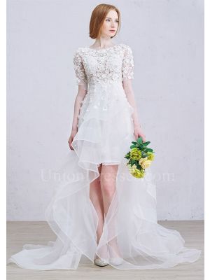- Beautiful Civil Short Sleeve Embellished Lace Tiered Organza High Low Wedding Dresswas $956.00 Special Price $189.00