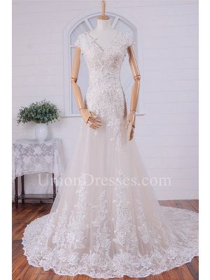 - Elegant Mermaid Scoop Sheer Back Short Sleeve Beaded Lace Tulle Wedding Dresswas $898.00 Special Price $189.00