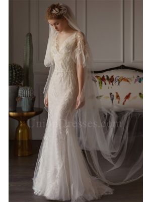 9. Princess Mermaid V Neck Low Back Cap Sleeve Ivory Lace Wedding Dress