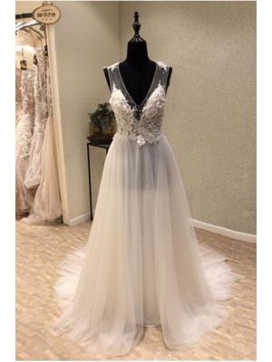 - Sexy A Line V Neck Open Back See Through Tulle Wedding Dress With Appliqueswas $978.00 Special Price $175.00