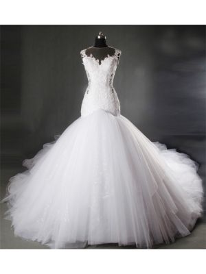 - Fit And Flare Illusion Neckline Lace Tulle Puffy Wedding Dress Chapel Trainwas $1,800.00 Special Price $315.00