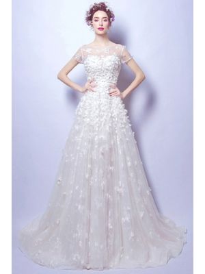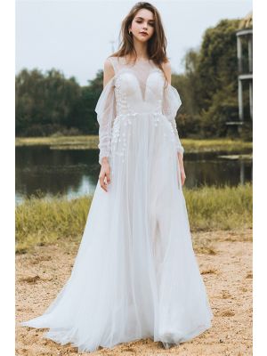 - Princess Sheer Neckline Back Tulle Flower Bohemian Wedding Dress With Sleeveswas $978.00 Special Price $190.00