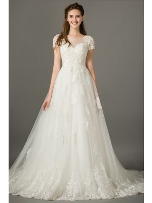 - A Line Scoop Neck Short Sleeve Tulle Lace Wedding Dress Bow Corset Backwas $885.00 Special Price $195.00