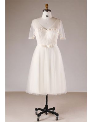 - V Neck Cape Sleeve Tea Length Champagne Tulle Plus Size Wedding Dress Bow Beltwas $420.00 Special Price $115.00