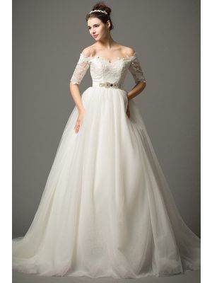 - Ball Gown Off The Shoulder Lace Sleeve Tulle Wedding Dress Crystals Sashwas $1,065.00 Special Price $210.00