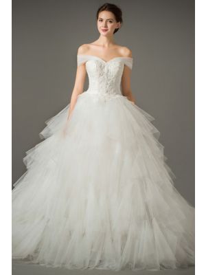 - Ball Gown Off The Shoulder Tulle Ruffle Layered Wedding Dress Chapel Trainwas $1,600.00 Special Price $270.00