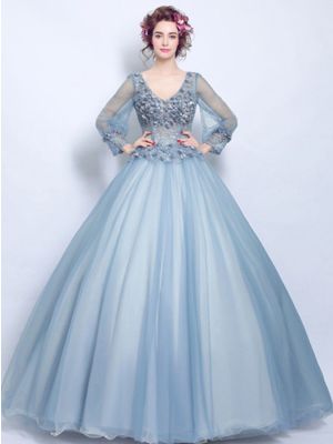 - Ball Gown V Neck Sheer Sleeve Dusty Blue Tulle Flower Wedding Prom Dresswas $658.00 Special Price $190.00