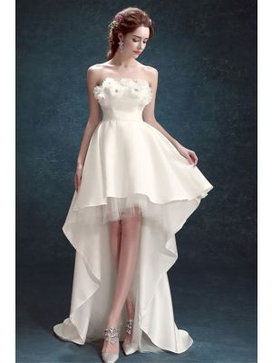 - Cute Strapless Flower Neckline Satin High Low Outdoor Destination Wedding Dresswas $655.00 Special Price $150.00